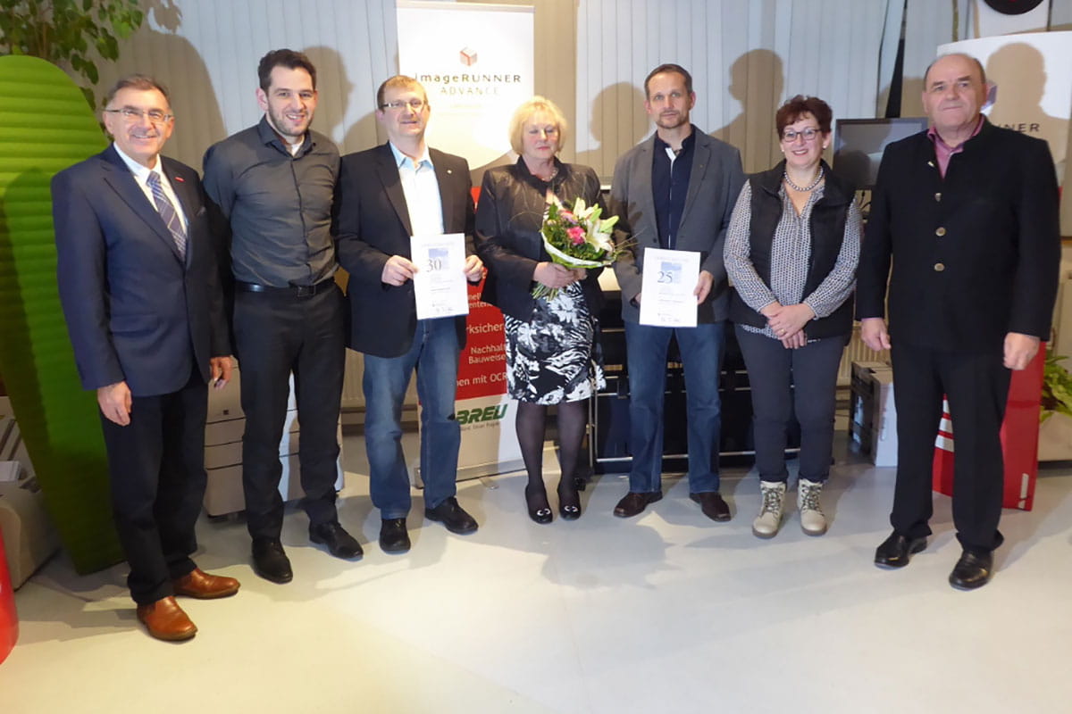 In Anwesenheit von Theo Pregler, dem Geschäftsführer der Kreishandwerkerschaft, wurden Hermann Heitzer für seine 30-jährige Betriebstreue und Helmut Schreckinger für seine 25-jährige Firmenzugehörigkeit geehrt. Verabschiedet wurde zudem Rosina Kögler.
